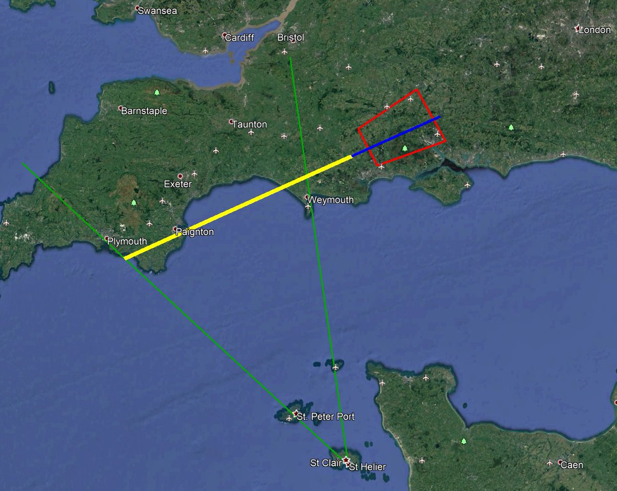 And so we get to the last bit on that diagram. The blue line – the so-called 'dark flight' of the meteor/meteoroid into the Wiltshire/Hampshire area with meteorites *potentially* dropping somewhere in the red box.