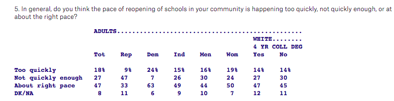 Public opinion story on school reopening has been pretty consistent. Most voters are not up in arms about unions or a rapid reopening. Also: throughout crisis, people really like safety precautions. (Other thing to remember—parents w/school age kids only ~25%. Lots on here tho.)