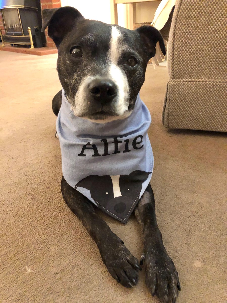 Alfie, a dashing 8yr old Staffy was diagnosed with lymphoma in '19. As part of his treatment he has regular visits to see Chiara & our Oncology team for his chemo. A fashion lover, Alfie likes to always look his best with his fabulous range of bandannas & jumpers