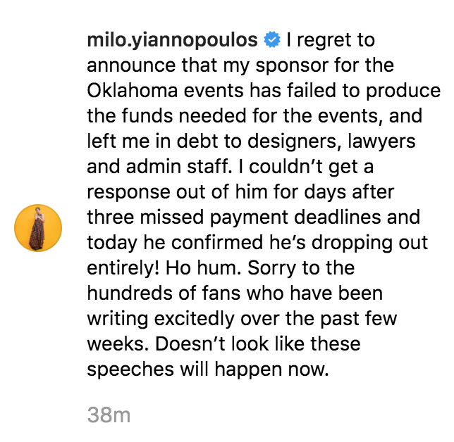 Yet another Milo Yiannopoulos tour has collapsed, leaving him even further in debt.pic.twitter.com/hvFpMxCcQ5