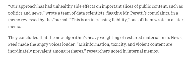 These leaked Facebook memos are the equivalent of when the tobacco industry tried to cover up the negative health effects of smoking. https://www.wsj.com/articles/facebook-algorithm-change-zuckerberg-11631654215?mod=e2tw …pic.twitter.com/D9gaw5ZUR1