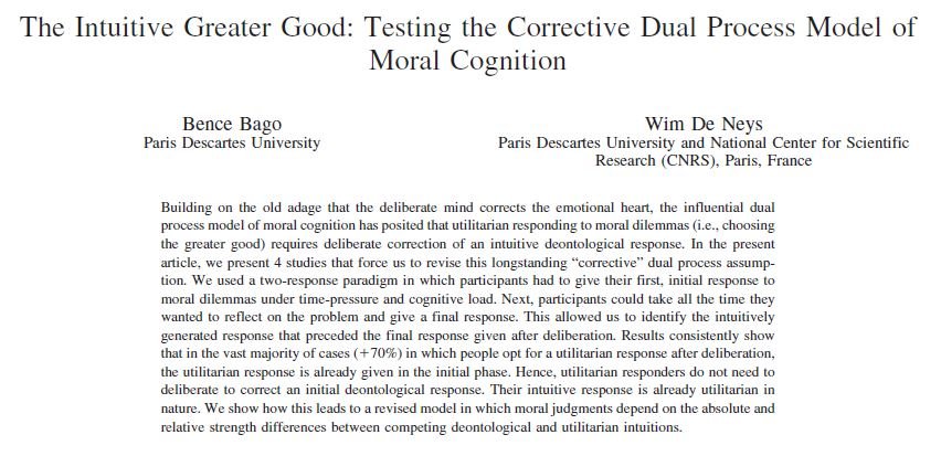 Our paper “The intuitive greater good: testing the corrective dual process model of moral cognition” with