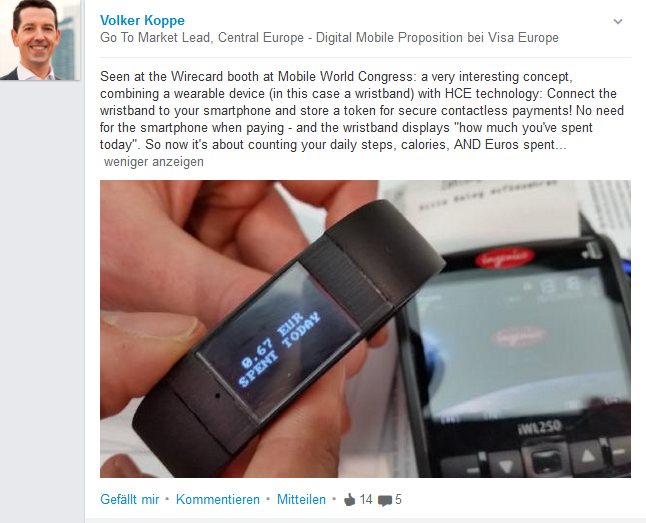 RT @VisaEurope_DE: Volker Koppe von Visa Europe beim #MWC15 am Stand von @Wirecard (via LinkedIn) pic.twitter.com/wOXc9E9Eo9"