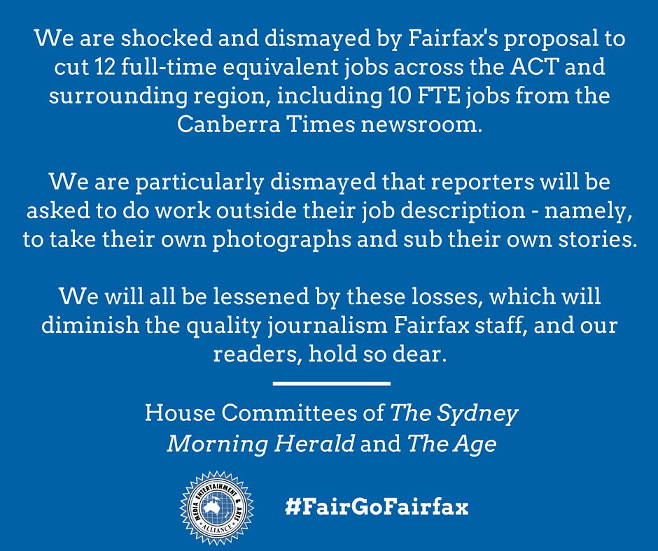 Solidarity statement to journalists at @canberratimes from colleagues in Syd and Melb. #MEAAmedia #fairgofairfaxpic.twitter.com/mKOxUiz9uf