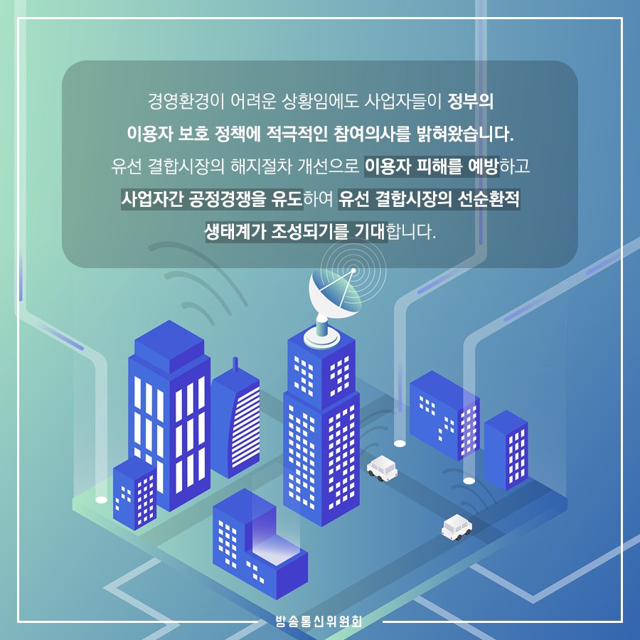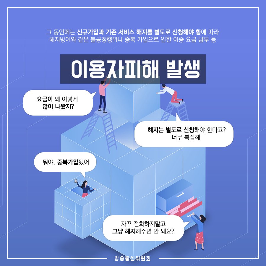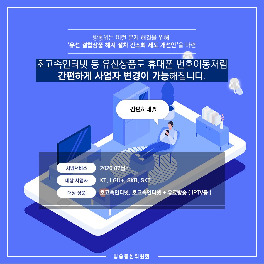 방통위는 사업자들의 부당한 해지 제한 행위와 사업자 전환과정에서 발생할 수 있는 해지 누락 피해를 근본적으로 막고, 이용자 편의를 증진하기 위해 ‘유선 결합상품 해지절차 간소화 제도개선안’을 확정․발표하였습니다 +더 자세한 내용은 아래 블로그에서 확인하세요