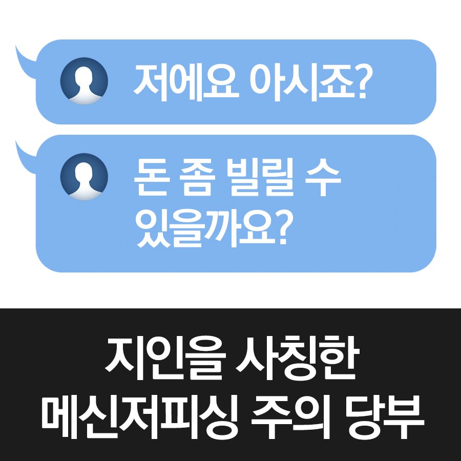 방송통신위원회, 금융위원회, 금융감독원, 경찰청은 올해 지인을 사칭한 메신저피싱 피해가 급증함에 따라 국민들의 피해를 예방하기 위해 「메신저피싱 피해예방 문자메시지」를 발송합니다. +더 자세한 내용은 아래 블로그에서 확인하세요