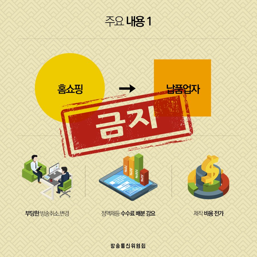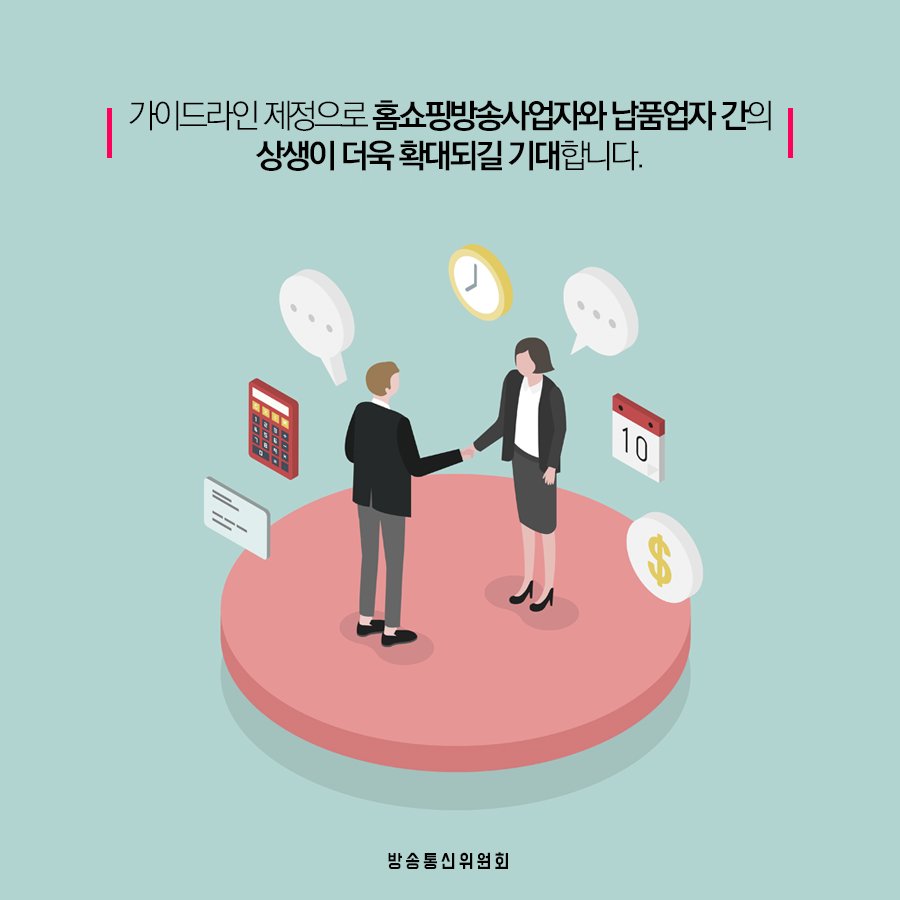 방송통신위원회는 홈쇼핑방송사업자와 납품업자 간의 공정한 거래 질서를 확립하고 상생협력을 도모하기 위해「홈쇼핑방송사업자와 납품업자 간 상생환경 조성을 위한 가이드라인」을 제정하였는데요, 카드뉴스로 자세히 살펴볼까요? http://blog.naver.com/kcc1335/221428269208 …pic.twitter.com/QcQ75xLGpP