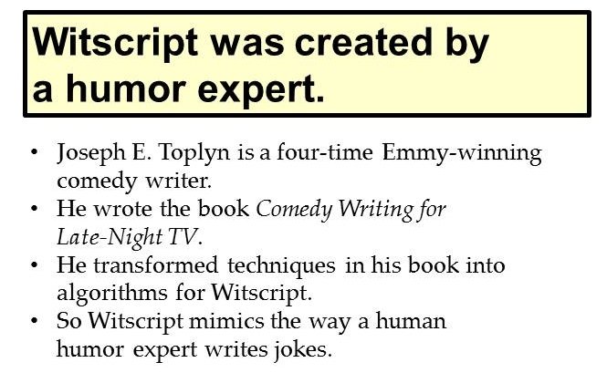 Meet Witscript, the first artificial intelligence to ad-lib real jokes. https://bit.ly/2Jj3i1l Witscript's computational humor makes a conversational AI more humanlike. Patent pending.