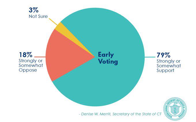 The poll, run by Secure Democracy, a nonpartisan organization, also showed 79% of Connecticut voters in favor of early voting. Merrill suspects the early voting question could be on the ballot as soon as 2022. No excuse absentee voting will likely have to wait until 2024. /3pic.twitter.com/XbznhGSLU7