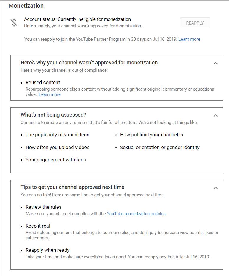 Thanks for the screenshot. Just to confirm, were you a part of YPP earlier and now demonetized, or is it the first time you've applied and were rejected? Let us know.