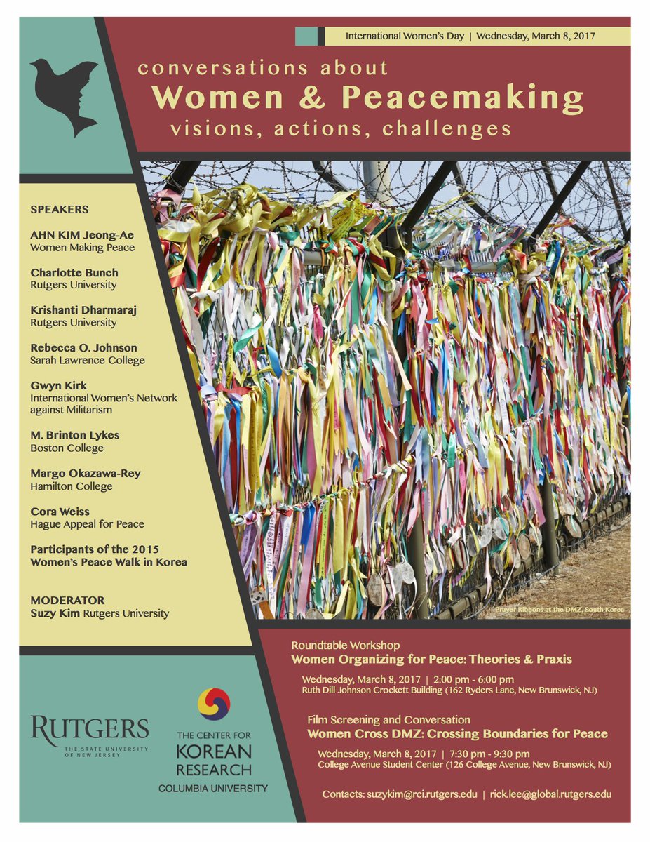 @RutgersU this Wed Mar 8 for w Roundtable Workshop on PeaceMaking (2pm) + Film Screening (7:30pm)! https://www.womencrossdmz.org/conversations-about-women-peacemaking-vi …pic.twitter.com/9qkrn2EDsR
