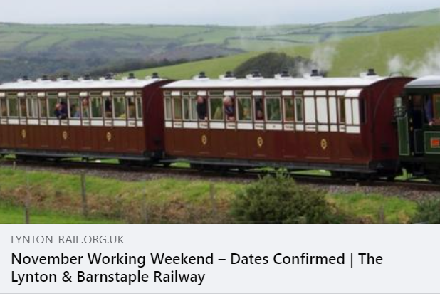 DATE FOR YOUR DIARY - NOVEMBER WORKING WEEKENDS RESUME --- FRIDAY 26TH TO SUNDAY 28TH NOVEMBER --- For details or to let us know you are coming contact Stuart Nelhams - stuart.nelhams@lynton-rail.co.uk or Pete Snashall - peter.snashall@ntlworld.com https://www.lynton-rail.org.uk/story/november-working-weekend-dates-confirmed …pic.twitter.com/505t7hDPmQ