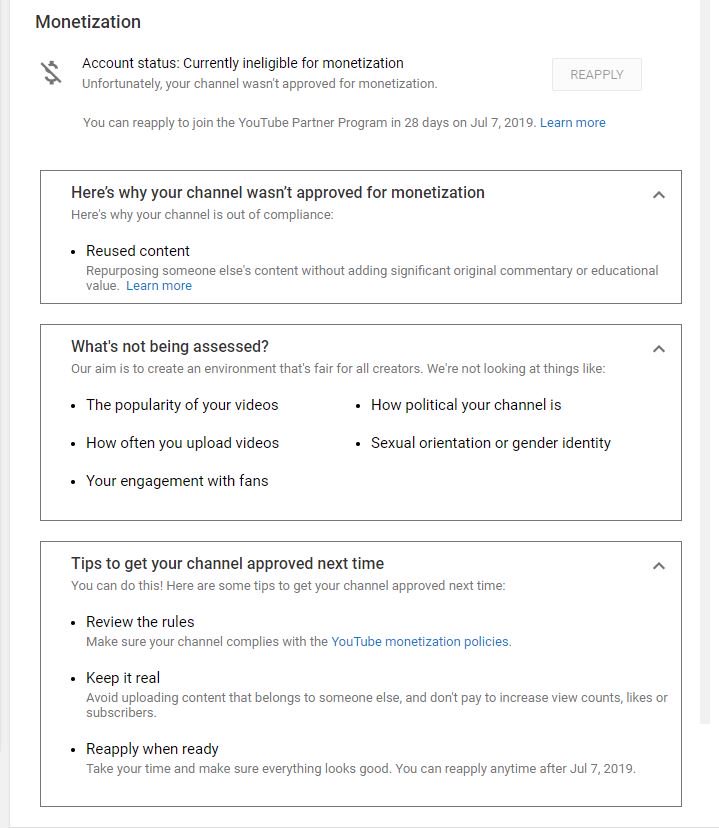 Thanks for the info. While we can't share specifics, you may want to take a look at our YPP policies to learn more about reused content and how you can avoid it in your videos: https://yt.be/help/AsbB . You can make changes accordingly & reapply after 30 days. Hope this clarifies.