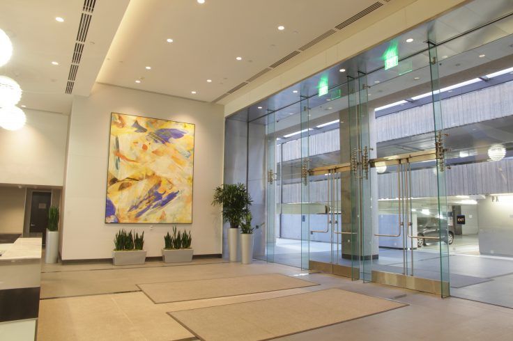 This 72 in x 240 in canvas brings a modern aesthetic to thisoffice building lobby in San Diego.