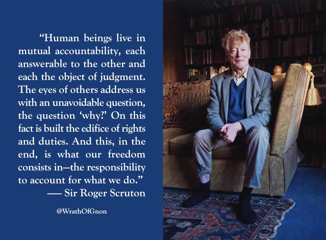 “And this, in the end, is what our freedom consists in—the responsibility to account for what we do.” — Sir Roger Scrutonpic.twitter.com/5WVec1cFar