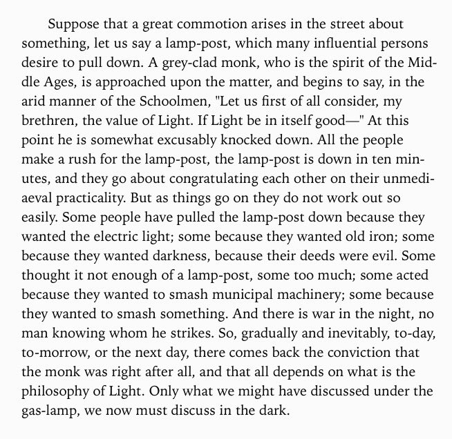 Maybe the most famous quote of his, 'Chesterton's Fence', the long version. From the book "The Thing", 1929. pic.twitter.com/5YVftpcBYP