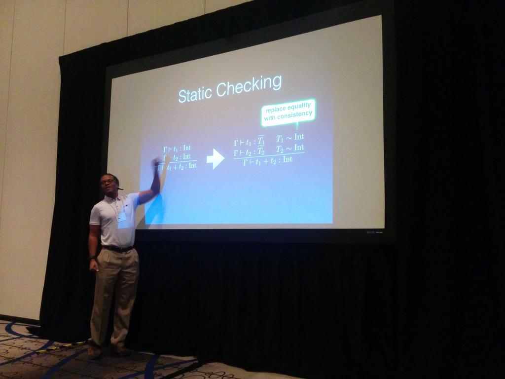 @rg9119 ) gives a tutorial on gradual type consistency as part of his#dsldi17 keynote talk.pic.twitter.com/TMp4xlzbF7
