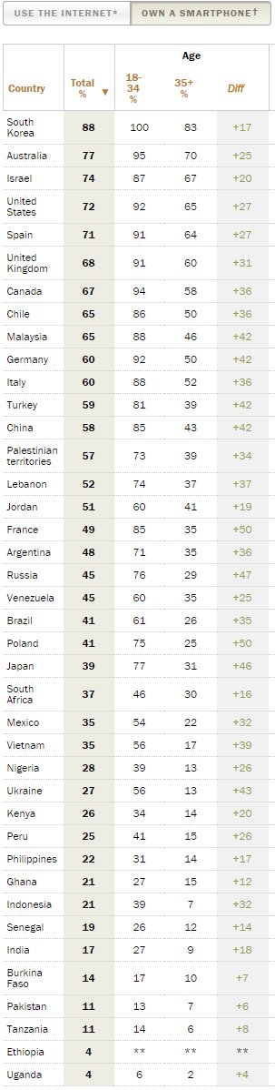 Own smartphone S Korea 88% US 72 Spain 71 UK 68 Chile 65 Germany 60 Brazil 41 Mexico 35 Nigeria 28 India 17 Uganda 4pic.twitter.com/eK5hGkn6AV