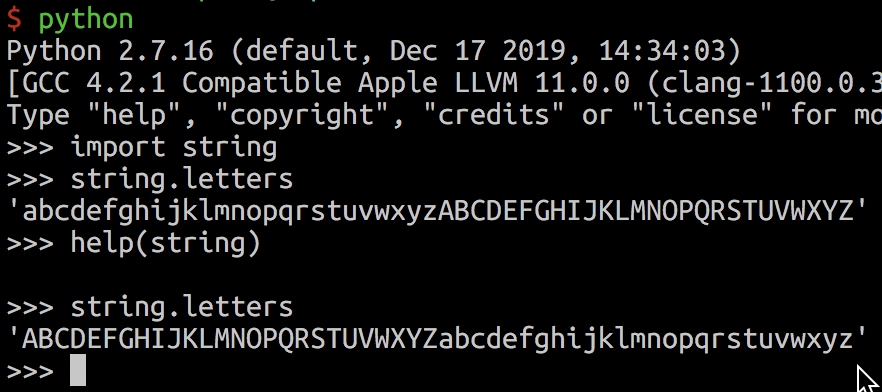 help() is calling locale.setlocale() to set the locale to the terminal locale setlocale() recomputes string.uppercase/lowercase and string.letters. it does the last one wrong. I'll file a bug :)