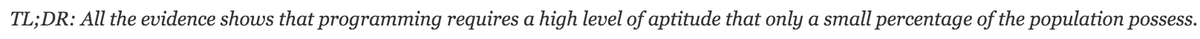 This article http://mikehadlow.blogspot.com/2015/12/learn-to-code-its-harder-than-you-think.html … is like telling people not to take a first aid course because medicine is hard. 1/