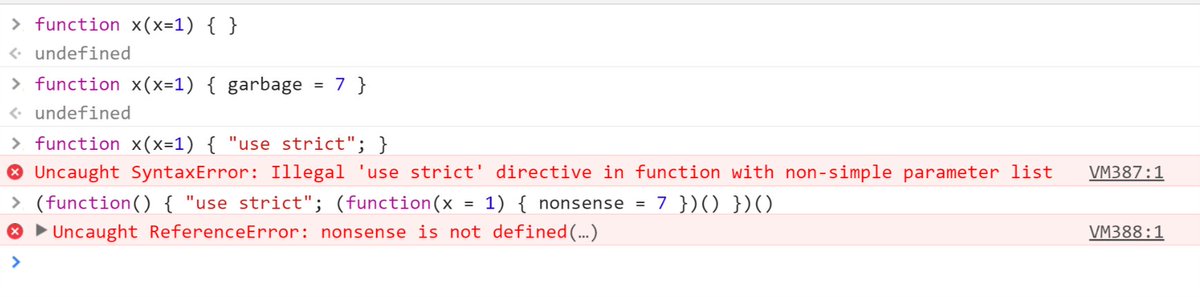 strict: function x() { new.target } function x(y=z) {} function x(...y) {} 1/