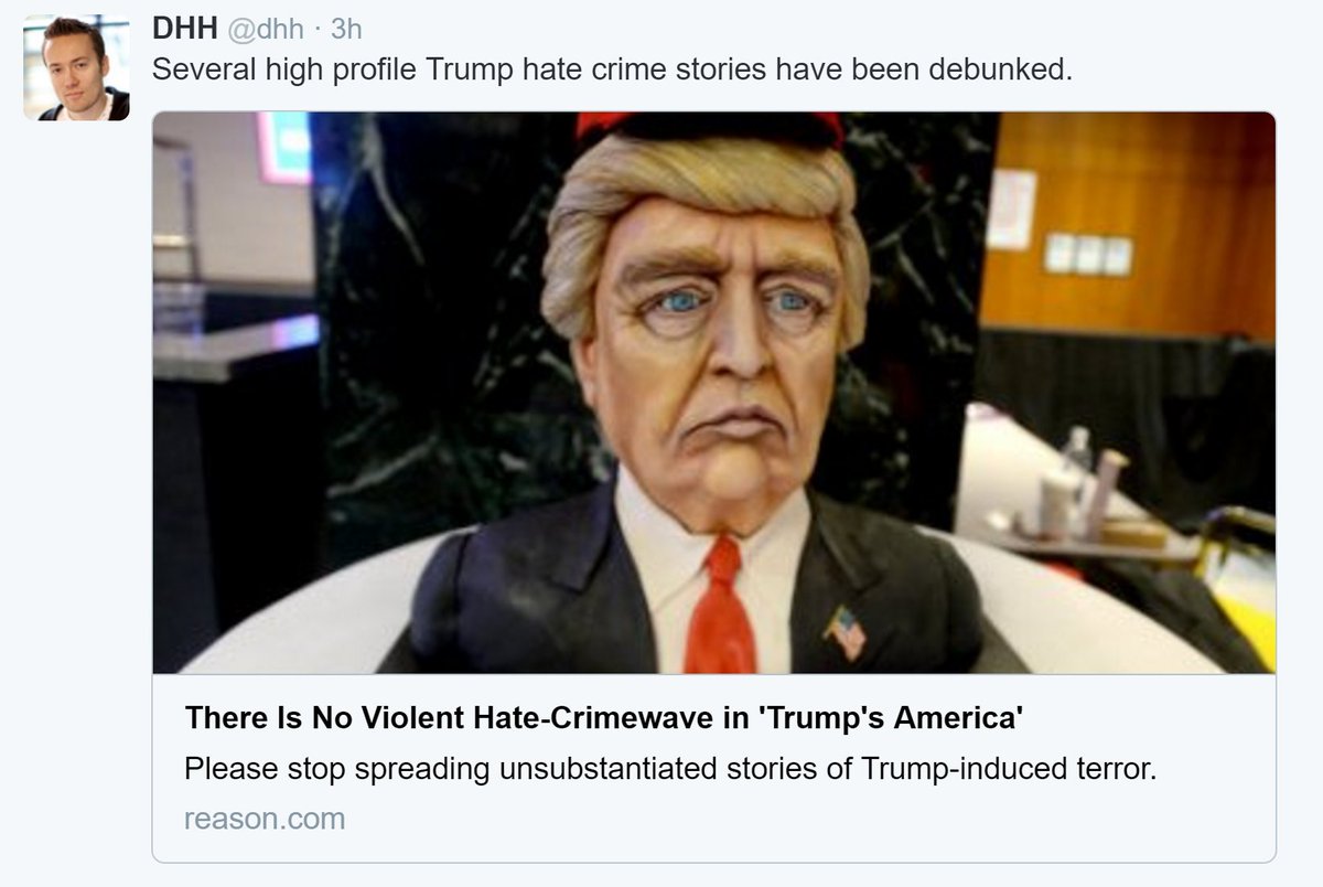 here's what I saw in my Twitter feed. "there is no violent hate-crimewave" that sounds like the stronger claim.pic.twitter.com/hGw6aNB61M
