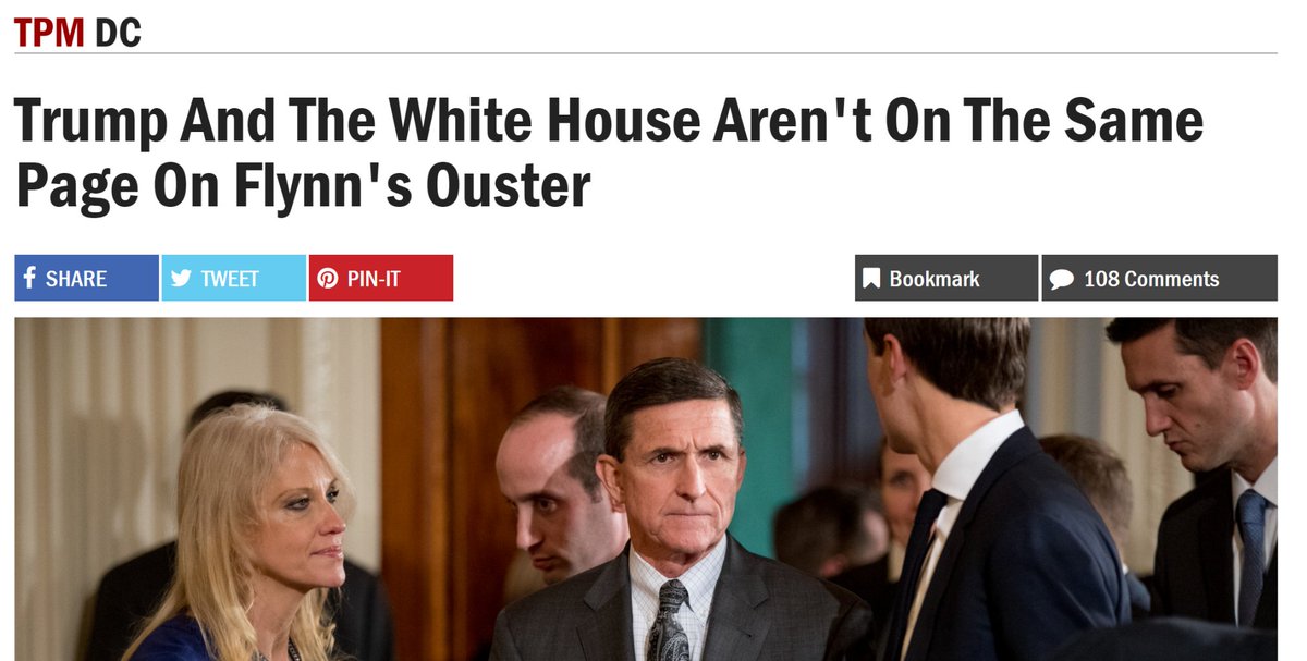 lemme fix that headline for you: "Trump and Trump from 10 minutes ago aren't on the same page on Flynn's ouster"
