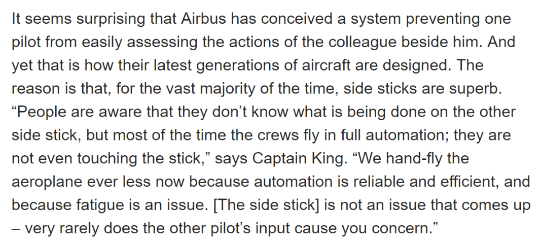 In traditional planes, the stick would be shared between the pilots, so the fatal "up" would have been caught. Somewhat article-relevant.