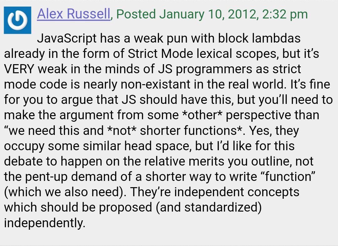 Alex was not alone in objecting to block lambdas and others shared Maciej’s objection. Block lambdas lost.