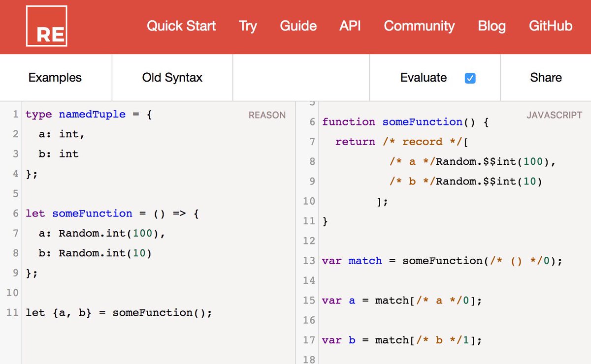 @reasonml to JavaScript. In fact the code on left is almost valid ES6 even.pic.twitter.com/xnjhjy1V8A