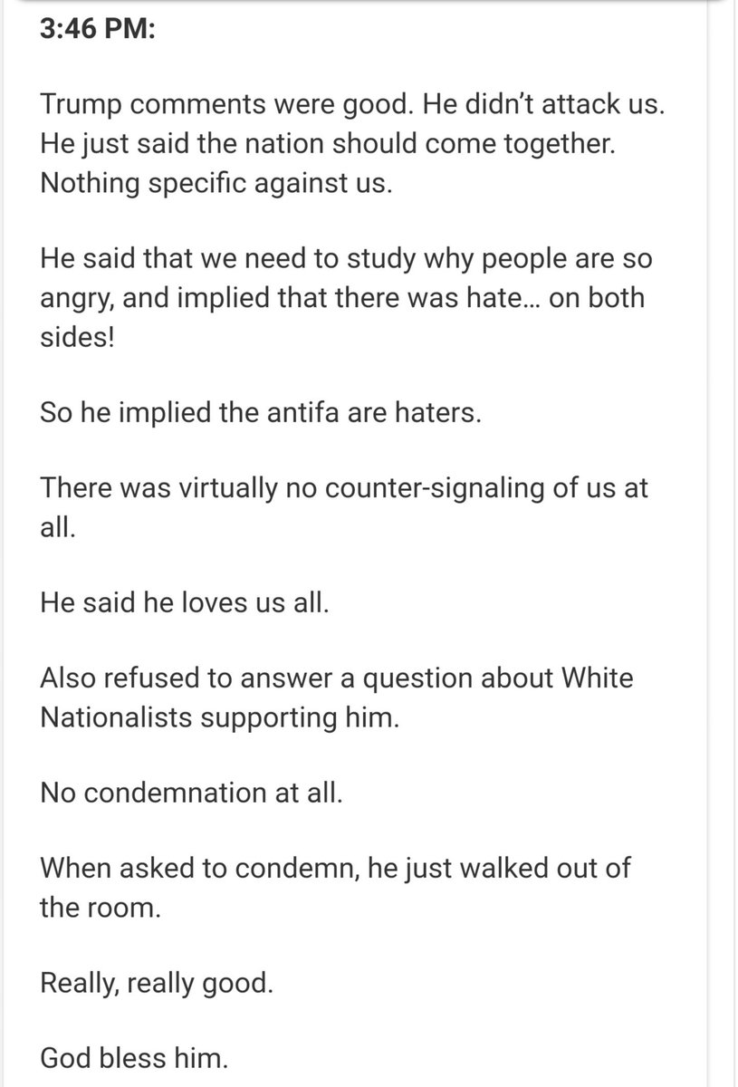 There's a difference between demanding a disavowal and him volunteering junk like "on many sides". Nobody forced him to say that. https://web.archive.org/web/20170814195122/https://www.dailystormer.com/unitetheright-charlottesville-live-updates/ … I'd ask you to read this and then decide whether there's a problem with POTUS granting credibility to it.