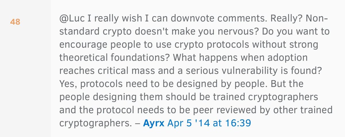 Yes, it would be really bad if people messed it up, but calling it a "crank encryption algorithm" is simply wrong and devalues the argument people are making. Do experts think that https://core.telegram.org/techfaq#q-i-39m-a-security-expert-and-i-think-your-protocol-is-not-secur … this contest is a fraud? $300k is pretty good...