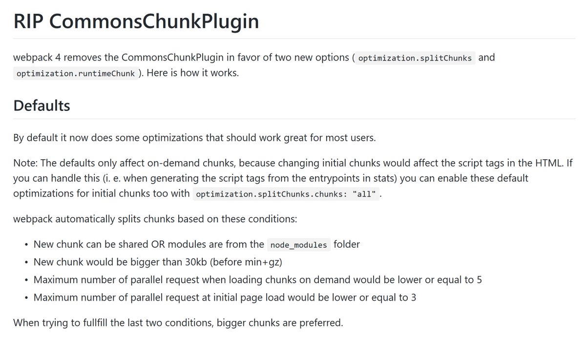 🚨🔥🔥🔥 We are removing CommonsChunkPlugin() in #webpack v4! 🔥🔥🔥🚨 For more information, see the write up @wSokra wrote as part of the design/documentation. PS: It's a #0CJS default 😘 too DOC: https://gist.github.com/sokra/1522d586b8e5c0f5072d7565c2bee693 … PR: https://github.com/webpack/webpack/pull/6341 … 👇👇 Doc images below: 👇👇pic.twitter.com/sB1pITKAiL