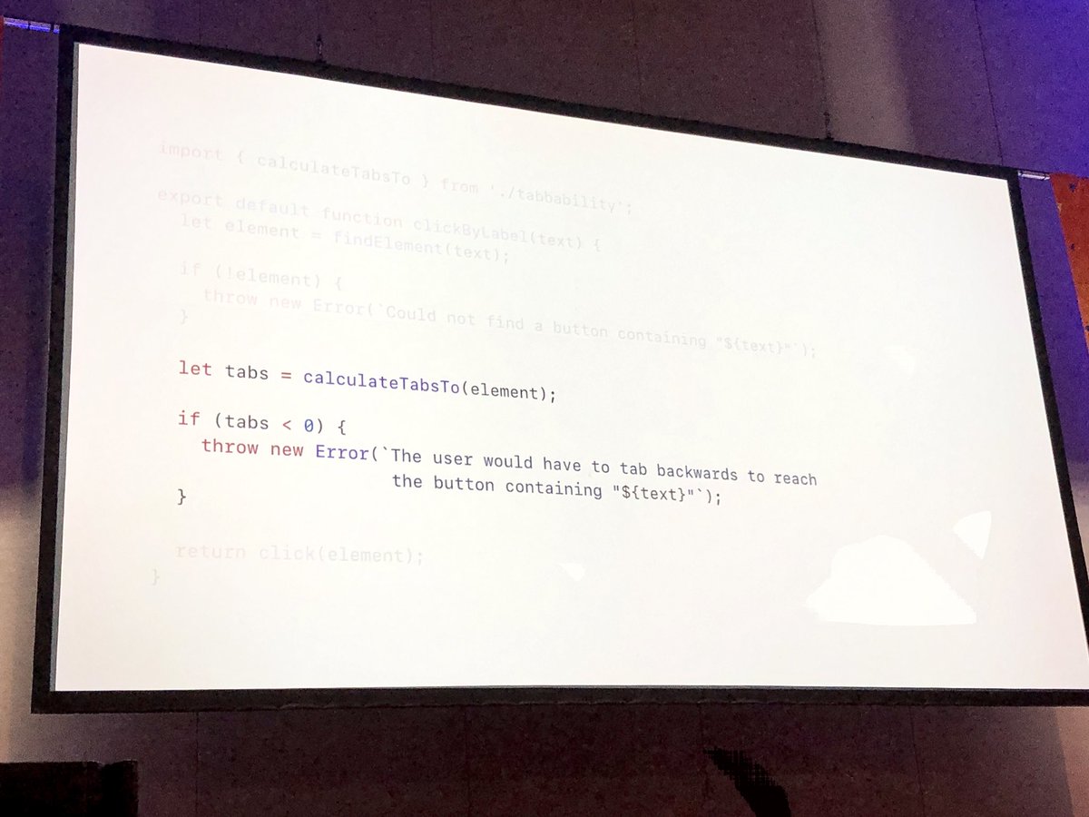 This talk by @jgwhite is great. Motivating good accessibility by how much they clean up acceptance tests. Easily verify that things like tab order are correct with simple test helpers. #emberconfpic.twitter.com/mVSabTUyb8