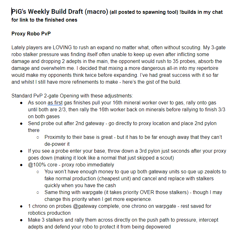 Spawning Tool is down but nothing can hold back the PiG's Weekly Build! Today it's a cheesy one, Proxy Robo PvP! Time to punish greedy expands! The full write-up is temporarily being hosted in the book of filth - right at the bottom of the document: https://docs.google.com/document/d/17IX0S9Lu4ALiaOq0J0xkeBu4ZCZzXhH9ePtbmYUHQ0U/edit?usp=sharing …pic.twitter.com/vwgWXQvCPH