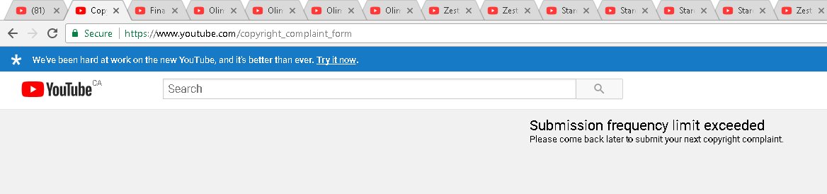 How am I supposed to deal with people mass uploading videos of mine as their own if this triggers after a dozen or so reports???pic.twitter.com/j7PnuC7KjQ
