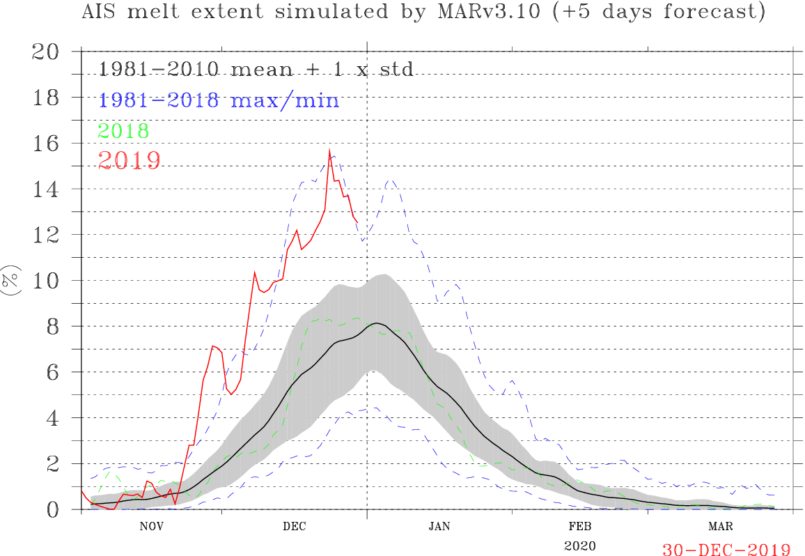 MAR forced by GFS suggests that the highest melt extent over Antarctica in the modern area (>1979) has been reached on 24-Dec-2019 with ~15%. From Nov 2019 until today, the production of melt water is also a record with 230% higher than average but the melting season is not endedpic.twitter.com/MT0QKCJ47e