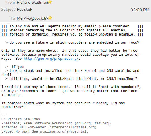 Richard Stallman shares his thoughts on installing GNU/Linux on a juicy steakpic.twitter.com/QxXmzdsH5r