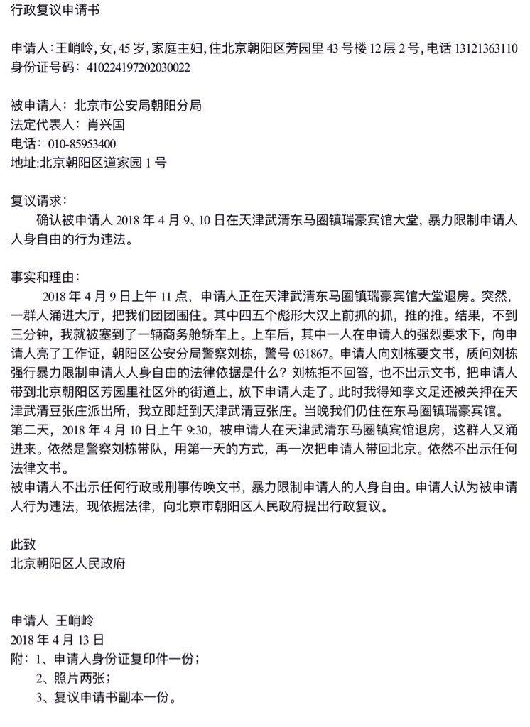 #李文足千里寻夫#徒步天津受暴力干涉,我们被统统带回北京。李文足、刘二敏被软禁。所以有了后来的文足爬上窗台,高空一呼。事情不是到此就结束了,新的内容要开始了。我对北京市朝阳区人民政府,提出行政复议申请。请求确认北京朝阳区公安分局的此行为违法。pic.twitter.com/D8GquUSDCW
