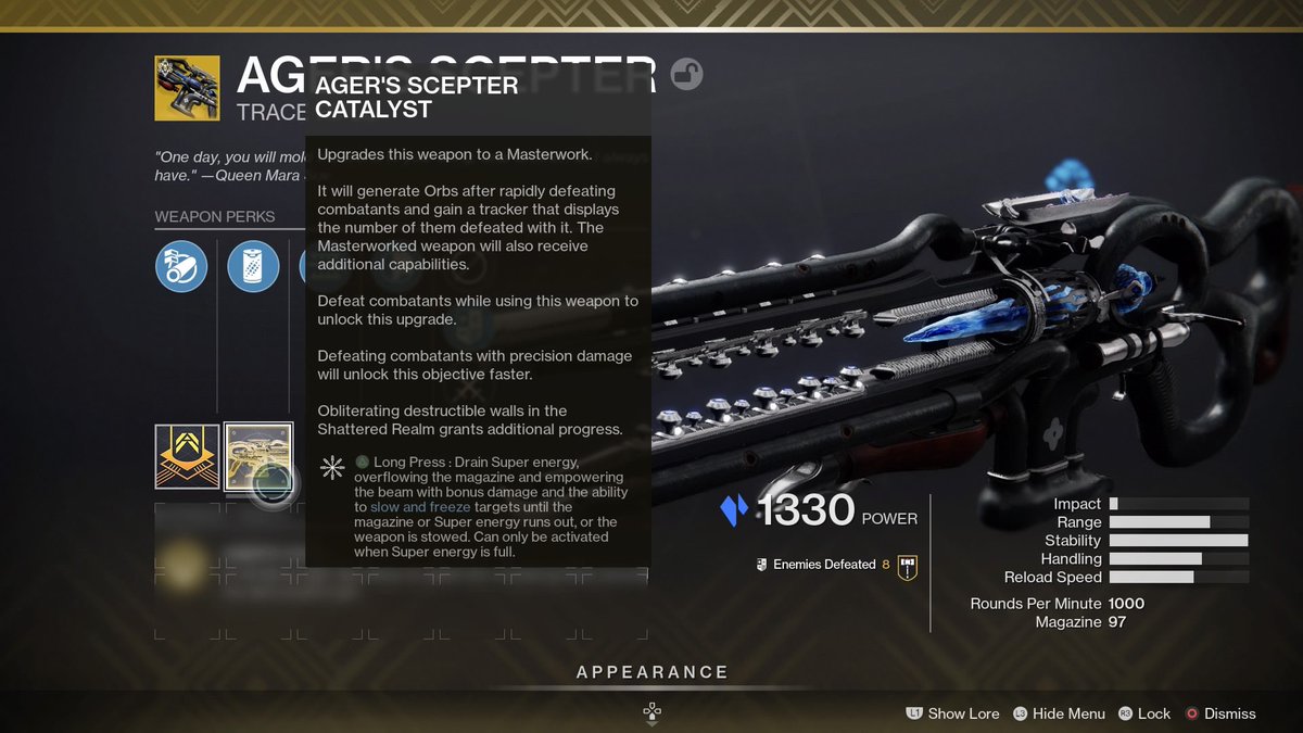 @BungieHelp my agers scepter catalyst states to long press triangle, which on PS swaps to power. Not sure if it’s a bug or not but I am unable to proc it