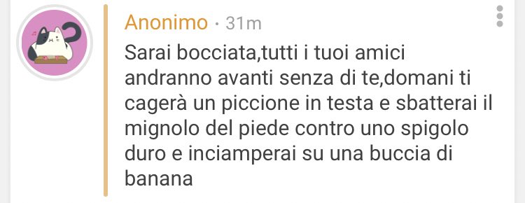 Siete proprio delle merde per augurare la bocciatura ad una persona che nemmeno conoscete, non sapete se sta passando un periodo di merda, se si sta impegnando al massimo per la sua carriera universitaria, se si sente insicura nel dare un esame. Vi piace spargere odio in anonimo
