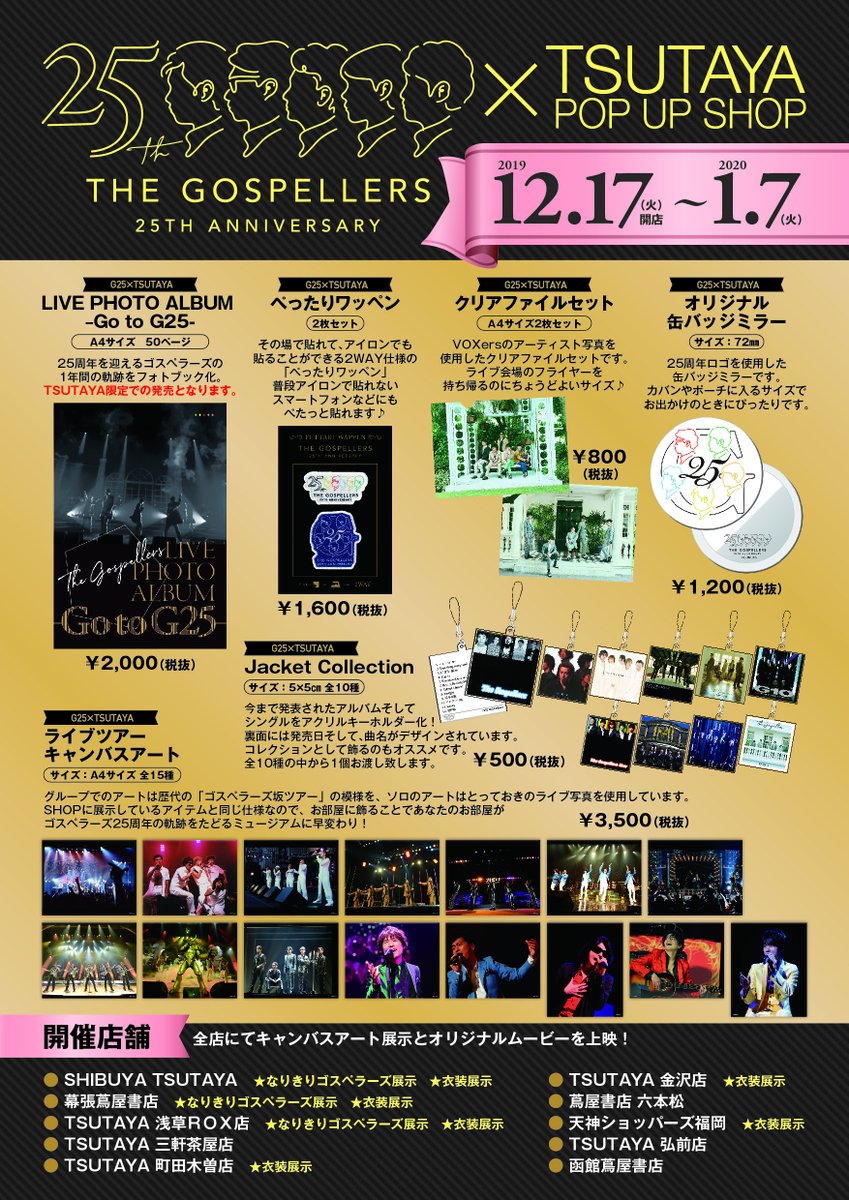 #Gospellers】 The Gospellers 25th Anniversary×TSUTAYA POP UP SHOP メジャーデビュー25周年おめでとうございます! 開催期間は再来週 2019/12/17(火)開店時~2020/1/7(火)閉店時、 ライブフォトアルバム等店舗限定オリジナルアイテムを限定販売♪#ゴスペラーズ#G25#TSUTAYApic.twitter.com/8cZmf5EeTL