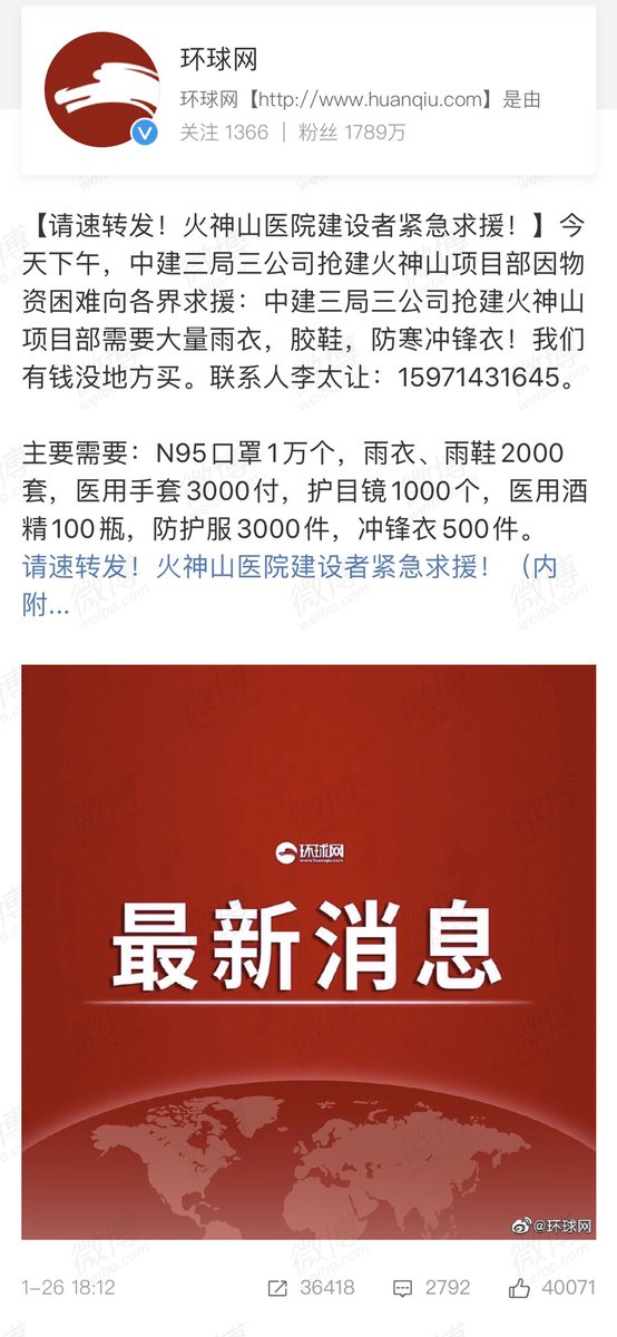 Both from Global Times. Left: Video of Wuhan pneumonia hospital construction went viral abroad, foreign netizens so envious they switched on sour lemon mode. Right: Emergency! Pneumonia hospital construction team short of masks, gloves, raincoats, rainshoes, etc. Please help!pic.twitter.com/6rj7Z2JoqG