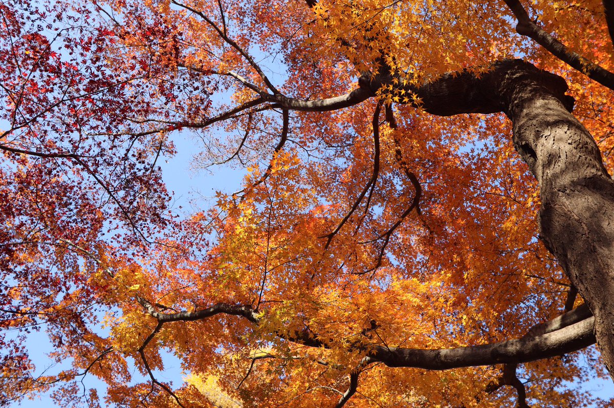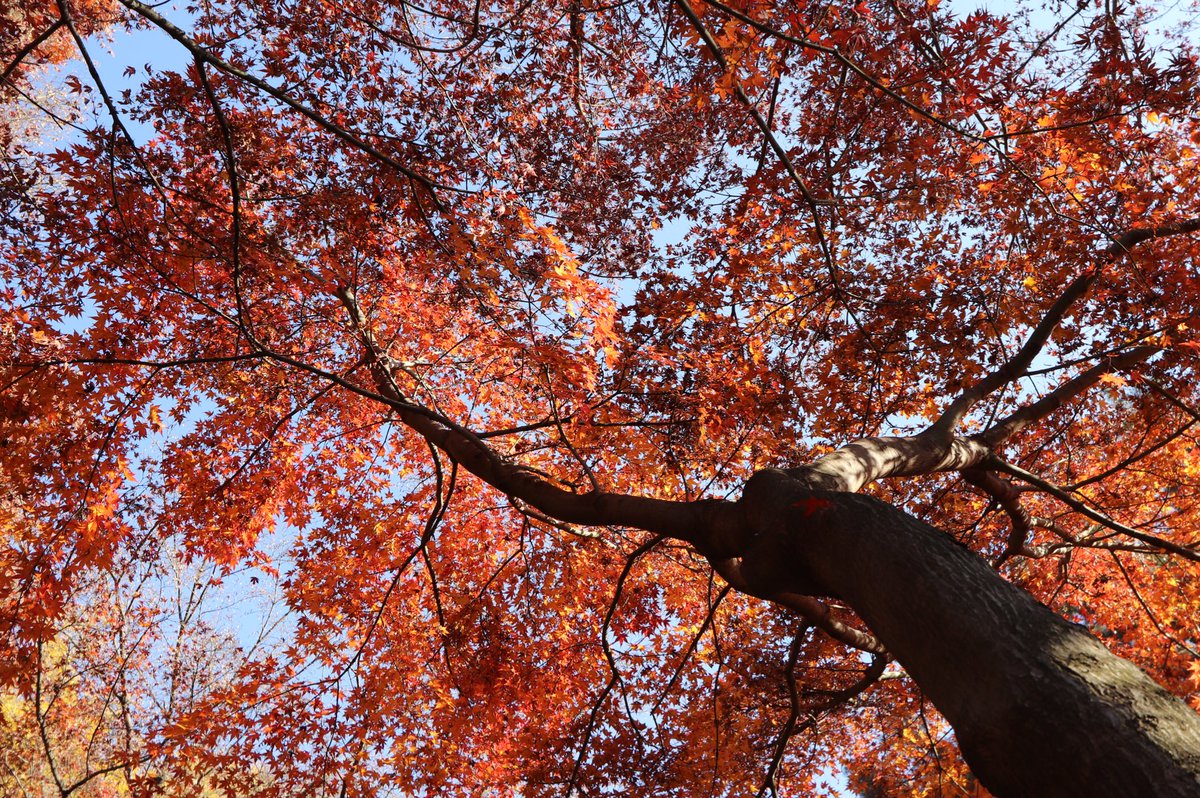 私の庭、唐紅色に染まりきれないイロハモミジも落ち葉の季節。 寂しくなる冬を引き立てる