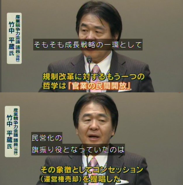 官業を民営化するのは、民間の経営者の方が官より優秀だと判断するからだね。さらに外資に売るのは、日本の経営者より外国の経営者が優秀だからだね。日本には無能な官吏と無能な経営者しかいない、そいつらに任せては日本は成長できないというのが竹中氏の判断なわけだ。ご高説承りました。明察です。