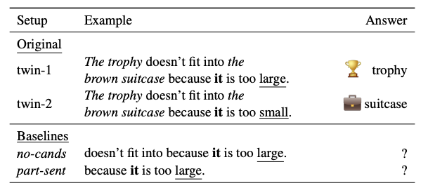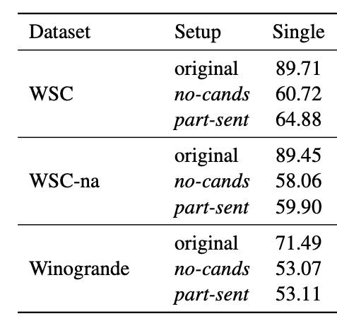 We find that WSC suffers from such artifacts, while Winogrande's test set, which was automatically filtered - much less.pic.twitter.com/kbRa1Fr3wZ