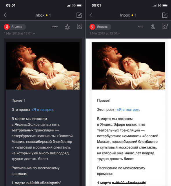 Мы долго шли к тому, чтобы пользователи мобильных приложений получили полноценную темную тему. Пришлось научится красить письма в темный цвет и перекрасить стартовый экран.pic.twitter.com/JAAvOP7I2f