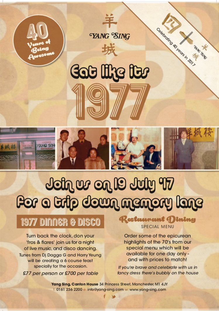 Celebrate 40 years of Yang Sing w/ us on 19/7/17. Enjoy a retro 70's night, a trip down memory lane & dust off your