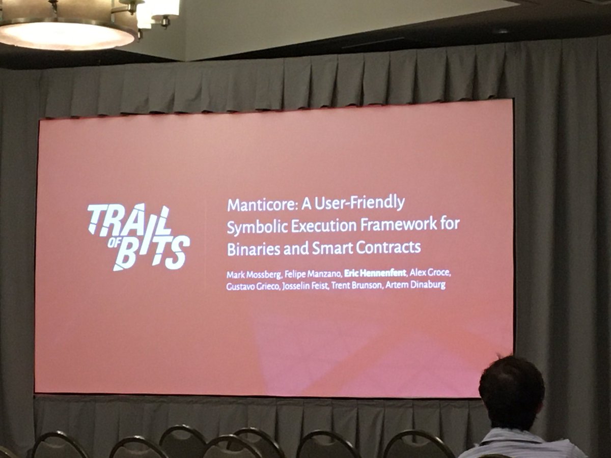 Great demo about Manticore, symbolic execution for binaries and smart contracts! @ASEconf2019 @Eric_Hennenfent #aseconfpic.twitter.com/e7GnviIRG4