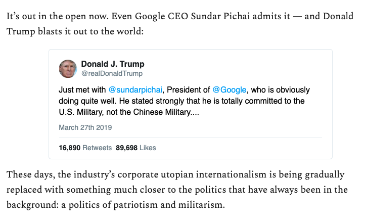 These days, the Silicon Valley's corporate utopian internationalism is being gradually replaced with something much closer to the politics that have always been in the background: a politics of patriotism and militarism.pic.twitter.com/8csyjyZa78